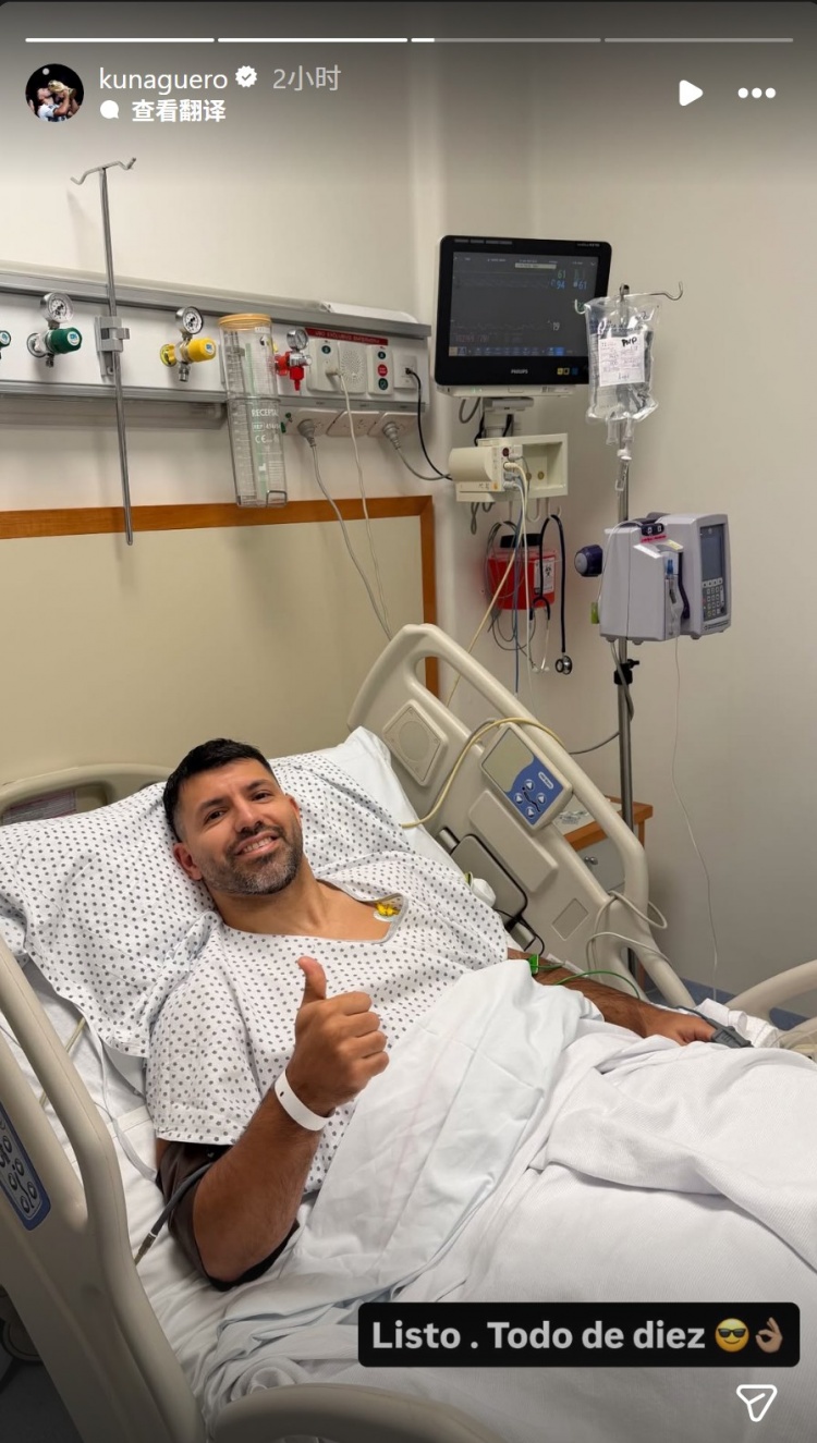 阿圭罗在业余比赛中肌腱断裂,因此接受手术,他在社交媒体上晒出躺在病床上竖起大拇指的照片,配文:“搞定了,一切都很顺利。”